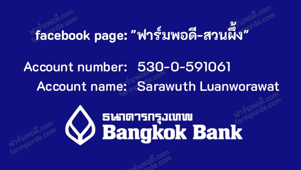 Whenever our products are almost ready, we will do a post in our facebook page, “ฟาร์มพอดี-สวนผึ้ง” for getting a pre-order. We accept a bank transfer to the following account of Bangkok bank (Only this account).